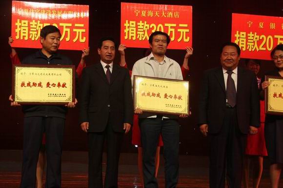 当晚,叶建敏董事长应邀观看了由宁夏残疾人福利基金会在自治区人民会堂举办的“大爱无疆 和谐永远”大型公益晚会,并在晚会现场领取由自治区领导为他颁发的牌匾。同时,他还做出了承诺:今后会尽自己最大的力量,继续关心帮助残疾人事业。