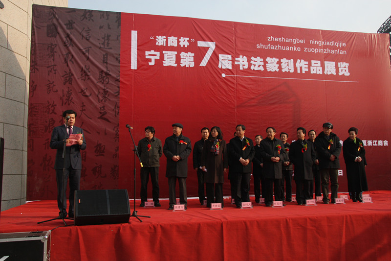 2012年1月7日下午3时,宁夏文学艺术界联合会和宁夏浙江商会联合主办,宁夏书法家协会承办的“浙商杯”宁夏第七届书法篆刻作品展在宁夏文化艺术中心展出。全国政协人口资源环境委员会副主任、宁夏回族自治区政协原主席任启兴,宁夏回族自治区人大原副主任黄超雄、宁夏回族自治区政协副主席陈守信,宁夏回族自治区副主席赵小平,宁夏浙江商会会长叶建敏和部分副会长,以及社会各界热爱书法艺术的嘉宾参加了开幕式。